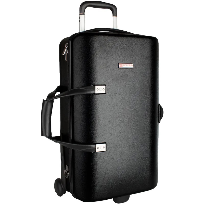 Der Protec BLT301T ist ein vielseitiger Zip Case Trolley, der Platz für eine, zwei oder bis zu drei Trompeten bietet. Der Innenraum lässt sich flexibel konfigurieren und nimmt Trompeten, Piccolo‑Trompete, Kornett, Flügelhorn und Zubehör sicher auf. Die robuste ABS‑Außenschale schützt zuverlässig vor Stößen, während der weich gepolsterte Innenraum für sicheren Halt sorgt. Leichtgängige Inline‑Räder und ein ausziehbarer Trolley‑Griff machen das Ziehen komfortabel. Gepolsterte Schultergurte ermöglichen zusätzliches Tragen auf dem Rücken oder über der Schulter – ideal für Schule, Proben und Auftritte.