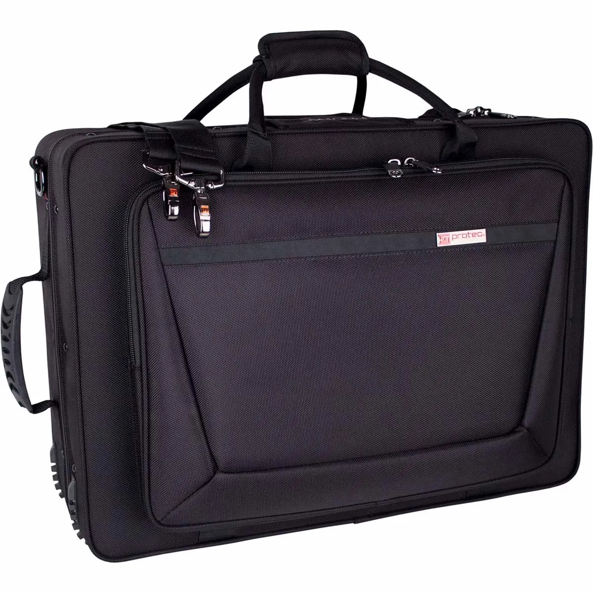 Der Protec PB301F ist ein robuster und vielseitiger Doppelkoffer, der speziell für Trompeten und Flügelhörner entwickelt wurde. Die wetterbeständige Außenseite aus extrem haltbarem 1680D Ballistic Nylon zusammen mit einem stoßdämpfenden Holzrahmen bietet hervorragenden Schutz für deine Instrumente. Der Innenraum ist mit weichem, nicht scheuerndem Velvoa‑Futter ausgekleidet und hält Trompete und Flügelhorn sicher an ihrem Platz. Zusätzliche Features wie ein großer Fronttaschen‑Organizer, ein integriertes Mundstückfach für bis zu vier Mundstücke und ein verstellbarer Schultergurt machen diesen Case besonders praktisch im Alltag.
