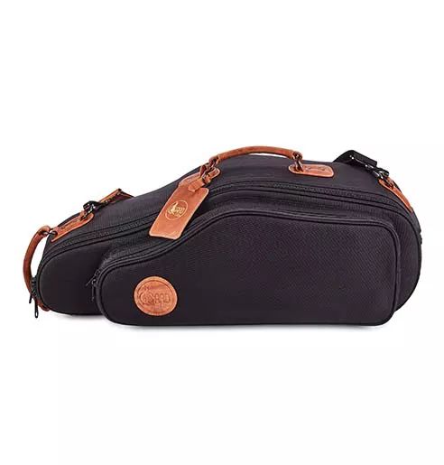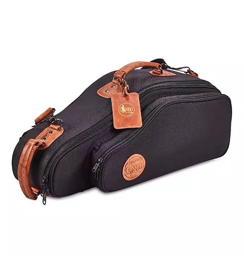 Schwarzes Ballistic Nylon mit edlen Lederbesätzen. Elegantes und besonders schützendes Altsaxophon-Gigbag aus strapazierfähigem 1680D Nylon-Gewebe mit hochwertigen Lederakzenten der Elite-Serie.