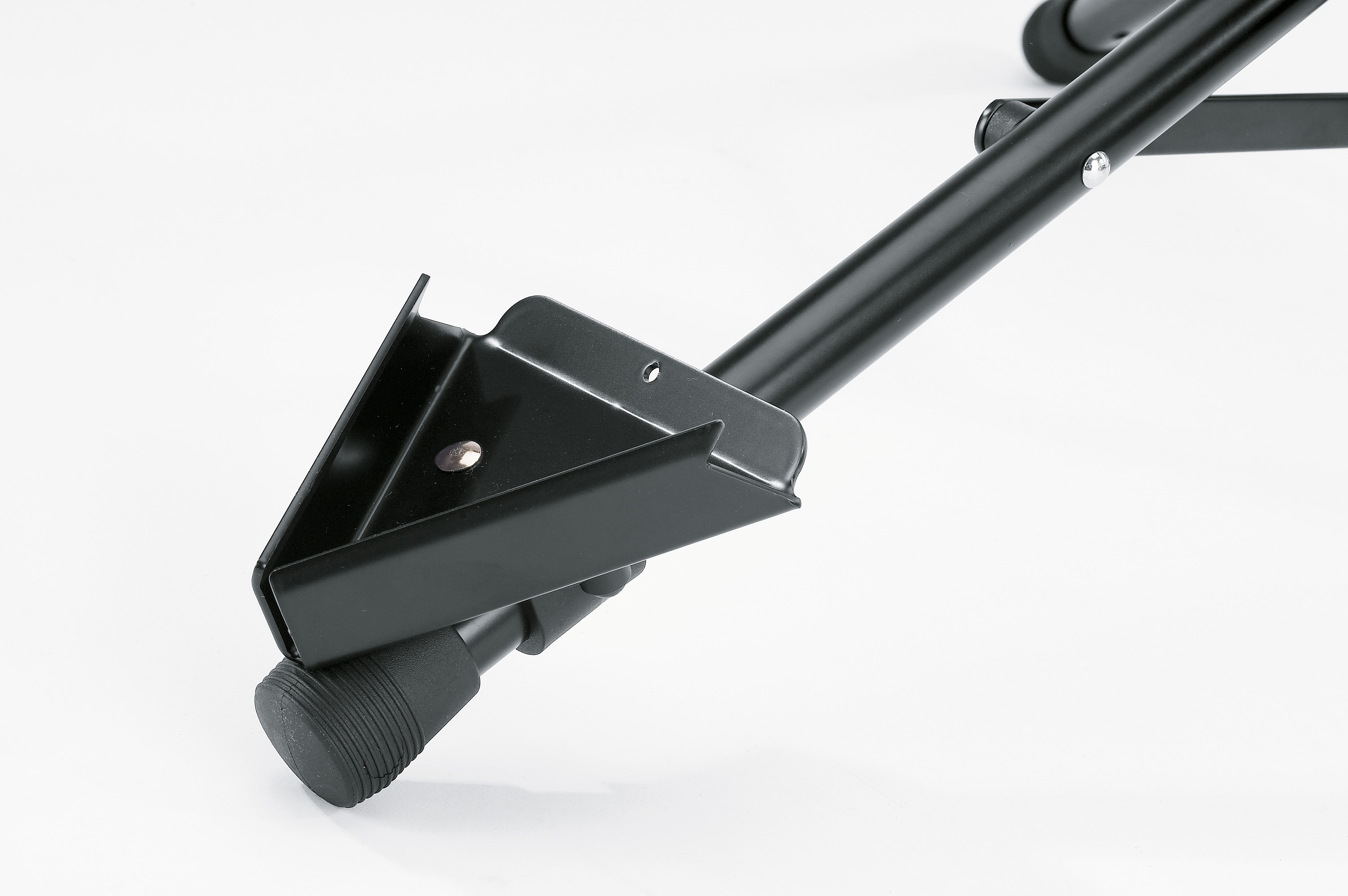 Der universelle Haltebügel kann sowohl in der Neigung als auch in der Breite verstellt werden. Durch Umstecken der abziehbaren Gummibacken kann die Bügelbreite individuell der Bass-Klarinette angepasst werden. Die neu entwickelte Auflageschale für den Stachel ermöglicht ein einfaches Abstellen und sorgt für einen sicheren Stand. Für den Transport kann der Ständer einfach und kompakt zusammengelegt werden..
